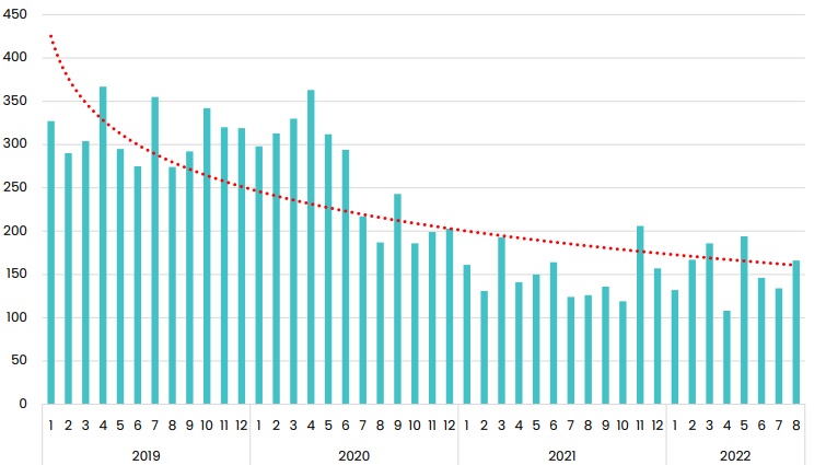 A total of 166* bankruptcies were declared in August 2022 (reference date 8-9-2022). This is 33 more than the number of bankruptcies last July 2022 (133), 40 more than the same period in 2021 (126), 21 less than the same period in 2020 (187) and 108 less than the same period in 2019 (274).